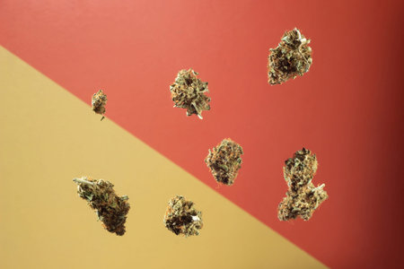 Dry buds of medical marijuana fly on a yellow and orange background.