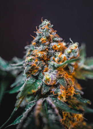 Close up macro of bud on cannabis plant ready to harvest. Car red modern strain.