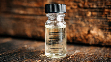 A clear glass vial sits on a rustic wooden surface, showcasing its elegant design and precise measurement markings. Perfect for illustrating laboratory or health themes.