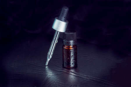 Plain brown glass flask-barrel with a black cover and a glass-dropper which abuts upon, all covered with water drops and is placed on a blacktextured background. Medicine or cosmetics implements concept. Place for text.
