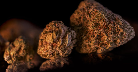 Background of a fresh harvest of buds of a cannabis on a black table. Concepts of cultivation of medicinal marijuana grow indoors