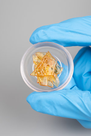 Piece of cannabis oil concentrate aka shatter used by medical marijuana patients isolated on a container