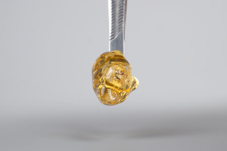 amber yellow cannabis wax concentrate dripping from the dabbing tool close-up.