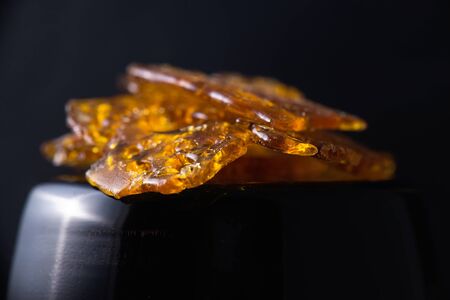 Close up detail of marijuana oil concentrate aka shatter isolated on black background