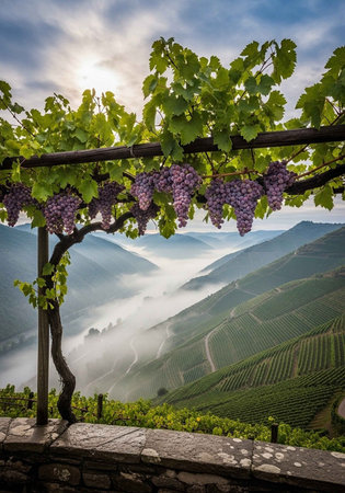 Landscape of vineyards in Lavaux region, Switzerland with fog