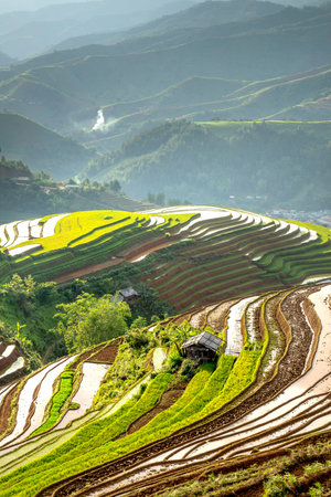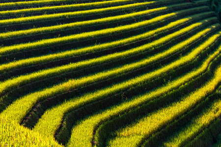 Paddy rice terraces, agricultural fields in countryside or rural area of Mu Cang Chai, Yen Bai, mountain hills valley on summer in South East Asia, Vietnam. Nature landscape background.
