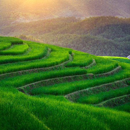 Landscape view sunset time with sun ray at green terraced plantation paddy rice field in Pa bong Pieng , Mae Chaem, Chiang Mai, Thailand
