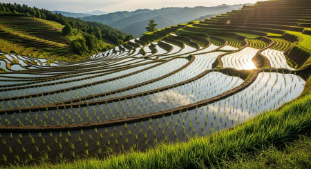 A serene landscape of rice terraces at sunset in a mountainous region
