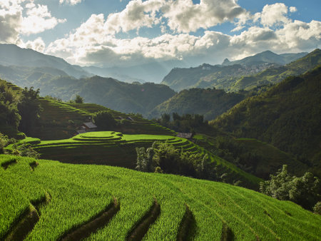 Landscape of green rice terrace with sunlight. Nature landscape. Green rice farm. Terraced rice fields. Travel destinations. Green environment. Organic rice farm. Green agricultural landscape.