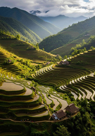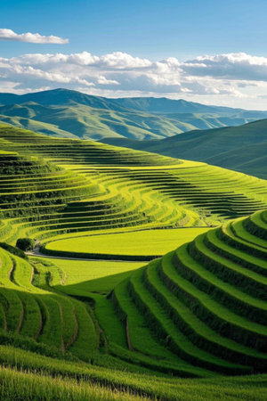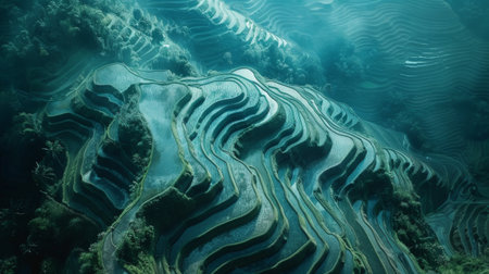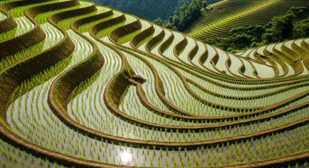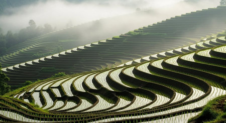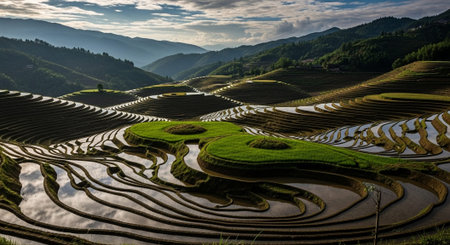 Intricate patterns of terraced rice paddies filled with water, reflecting the sky and clouds. lush green agricultural landscape on a steep hillside, showcasing traditional farming methods and natural beauty.