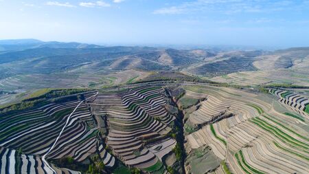 Aerial view of terraced farm field mass production during summer dry season in Tianshui, Gansu Province, China.