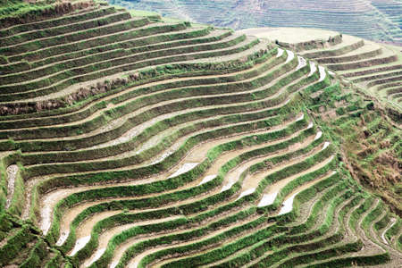 Curves of terraced rice field in Longji, Guilin area, Guangxi China