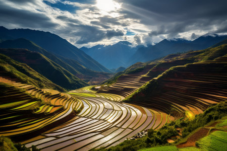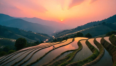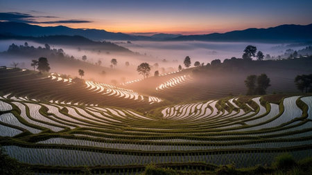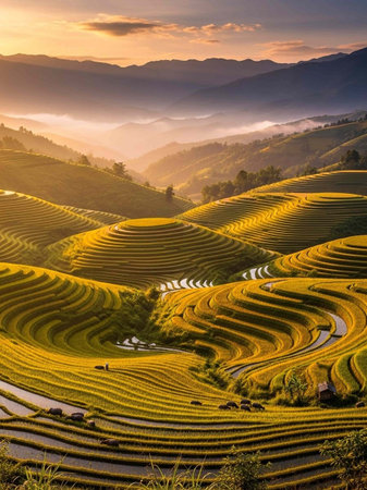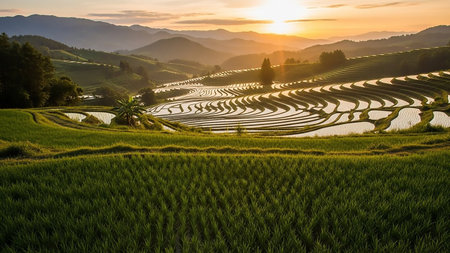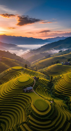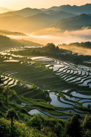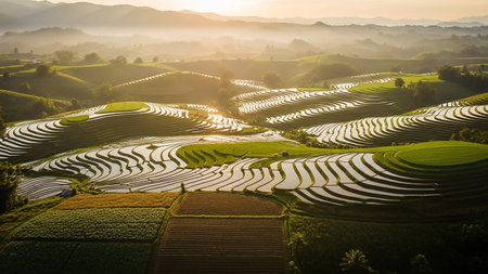 Sunset showing expansive terraced rice paddies reflecting golden sunset light creating a agricultural landscape with rolling hills and mist. resolution