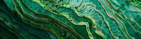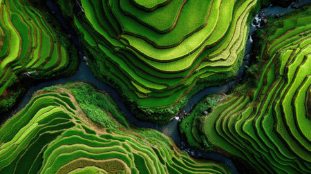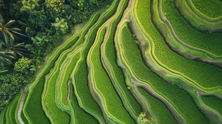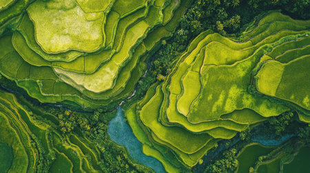This aerial image showcases vibrant green rice terraces with unique wave patterns, highlighting the beauty of agricultural landscapes and the intricacies of nature.
