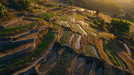 Aerial view of terraced rice fields in mountains with golden sunlight creating contrast on lush green agricultural steps