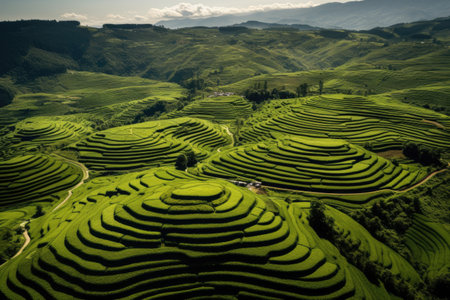 The aerial perspective of terraced rice fields unfolds layers of lush greenery, highlighting agricultural artistry and sustainability.