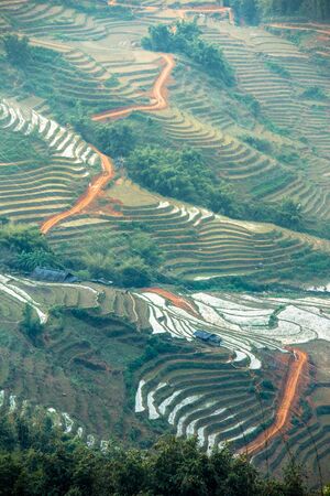 Vietnam Rice fields on terraced in rainy season at Mu cang chai, Vietnam. Rice fields prepare for transplant at Northwest Vietnam