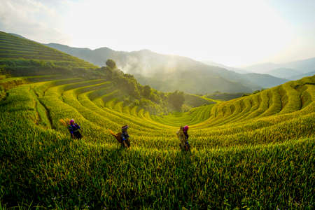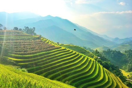 Majestic terraced fields in Mu Cang Chai district, Yen Bai province, Vietnam. Rice fields ready to be harvested in Northwest Vietnam.