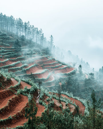 Terraced fields create striking patterns on a misty mountainside. Pine trees rise amidst the fog adding to the serene atmosphere of this tranquil rural area.