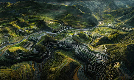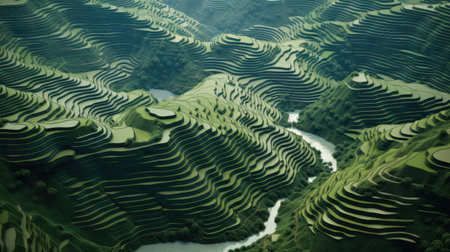 This high-resolution aerial image captures the sublime beauty of terraced rice fields carved into the mountainside. The verdant layers form a complex tapestry of hues ranging from deep emerald to soft sage, outlined by the golden earth. These ancient and sustainable agricultural practices create a breathtaking landscape that is as functional as it is beautiful. This image would be a perfect fit for environmental, agricultural, and cultural narratives, showcasing the harmony between human ingenuity and the natural world.