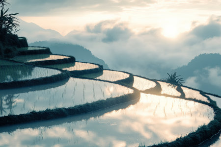 A serene landscape of rice terraces at sunrise with misty mountains