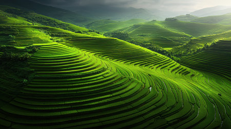 Stunning aerial view of lush green rice terraces showcasing intricate patterns across rolling hills under a dramatic sky, perfect for nature and travel themes.