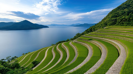 A Scenic view of terraced rice fields by tranquil lake surrounded by mountains