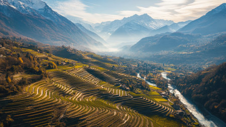 The tranquil landscape features lush terraced fields winding down a mountainside, surrounded by towering peaks and a serene river. The golden hour casts a warm glow over the valley.