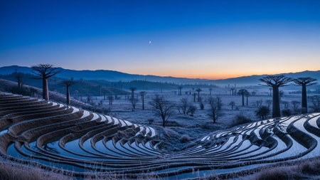 A serene winter landscape with snow-covered terraces at sunset