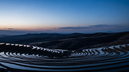 A serene landscape of terraced rice fields at dusk with a vibrant sky