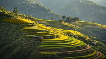 Experience the serene beauty of terraced rice fields bathed in golden sunlight at dawn, showcasing the harmony between agriculture and nature in a breathtaking landscape.