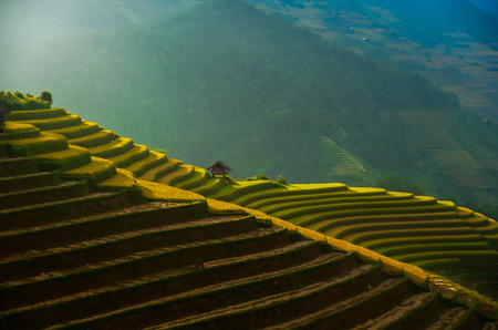 Rice fields on terraced with wooden pavilion at sunrise in Mu Cang Chai, YenBai, Vietnam.