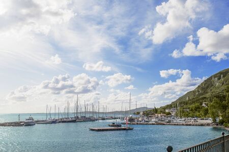 View of many white yachts in Ionic sea near Corfu island, Greece. Beautiful landscape of boats in blue water, sunny day.