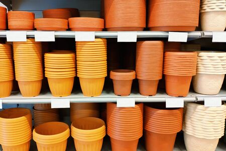 Large size new Empty garden Ceramic Decorate Pots in a row on store. Spring Gardening shopping.