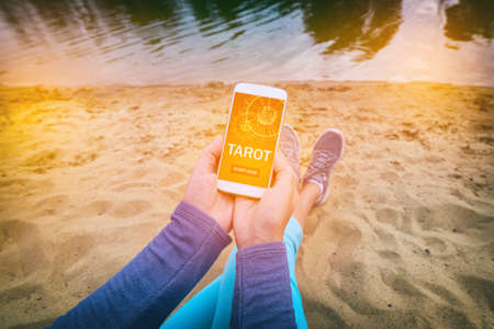 Woman holding smartphone with modern fortunetelling application on screen. Divination addiction concept