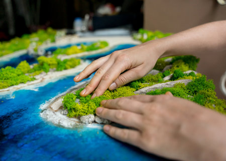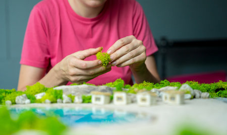 Kinetic sand. Simulator of the surface of the earth, mountains, hills, forest. The concept is to develop fine motor skills for children.