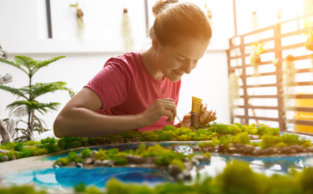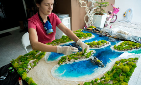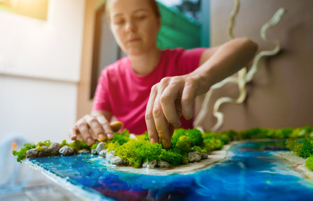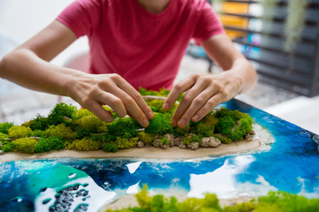 The process of making the art decor of epoxy resin, natural stones and moss