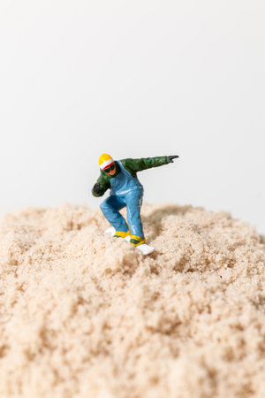 A tiny snowboarder figurine riding over a mound of sand, creative macro concept with playful outdoor adventure vibes.