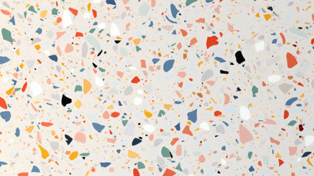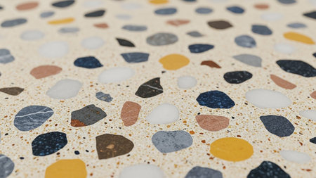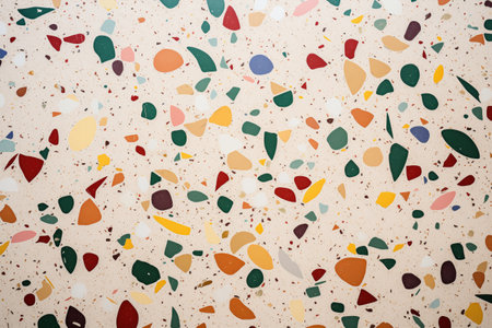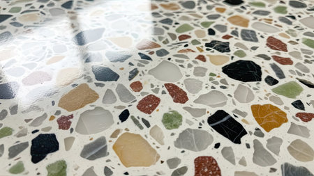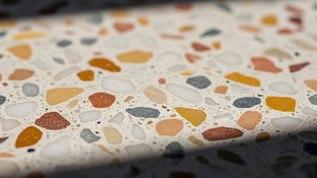 Close-up of a modern terrazzo surface, featuring colorful stone chips in a light matrix. Shallow depth of field emphasizes texture and pattern, creating a decorative background for design.