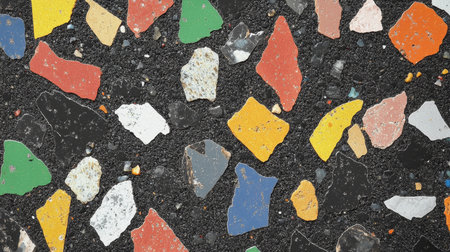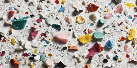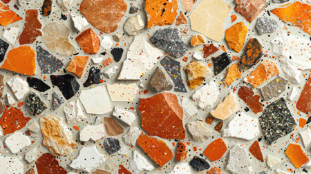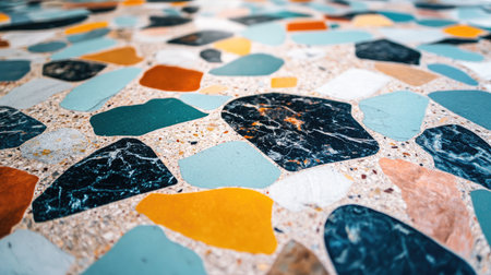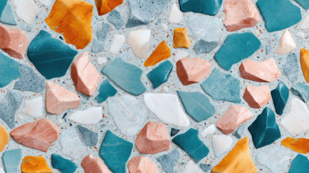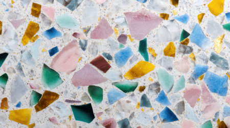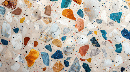 A macro view reveals an array of colorful chips in a stylish terrazzo design. The vibrant fragments unite in a harmonious blend, perfect for modern decor, creating an artistic focal point.