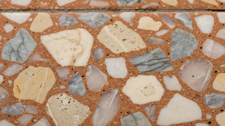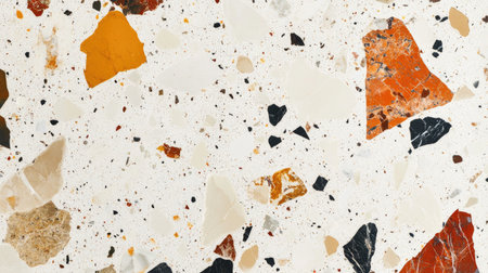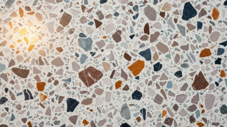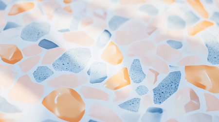 This image presents a close-up of a terrazzo surface with a mix of colorful fragments. The composition highlights various shapes and shades, including brown, orange, and blue. The pattern, illuminated by soft natural light, gives a clean aesthetic, ideal for use in design projects or background elements. Its versatility suits diverse commercial and artistic applications.