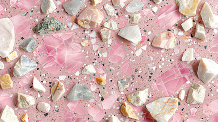 Pink terrazzo pattern background with scattered marble and stone chips in white, beige, and rose tones