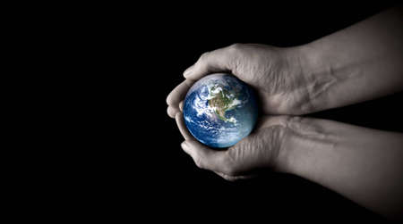 Two hands emerge from the darkness to gently hold a glowing Earth, conveying protection and responsibility for our planet.