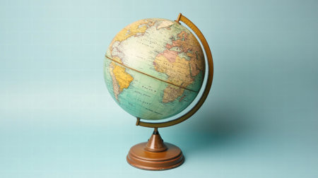 A vintage globe is positioned on a brass base, highlighting various countries and continents against a soothing light blue backdrop.