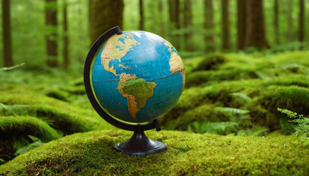 A small globe encircled by green leaves, set in nature, representing the bond between the earth and its environment