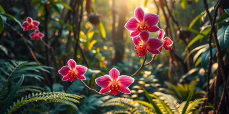 Discover the enchanting beauty of vibrant pink orchids thriving in a lush green jungle, illuminated by soft sunlight during the golden hour.