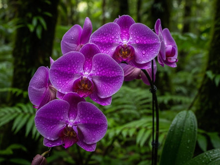 Vibrant orchid blooms in lush rainforest setting