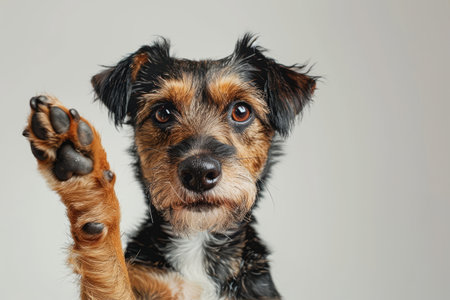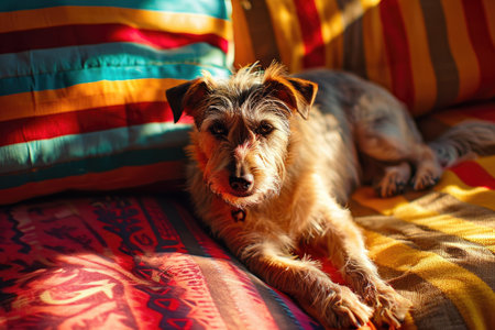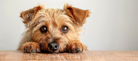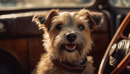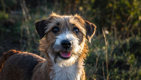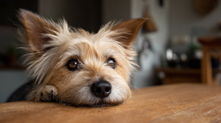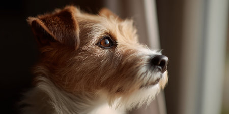 A charming portrait of an intelligent wire-haired terrier, captured in a moment of quiet curiosity. With its head turned to the side and an alert gaze, this scruffy companion exudes personality and loyalty against a soft, warm background.