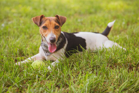 Cute happy smiling jack russell dog laying on a grass in park. Summer warm day