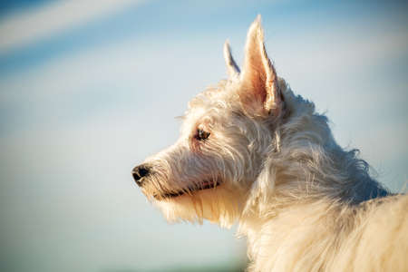 Funny yong West Highland White Terrier Dog, looking aside, close up portrait with blue sky in background